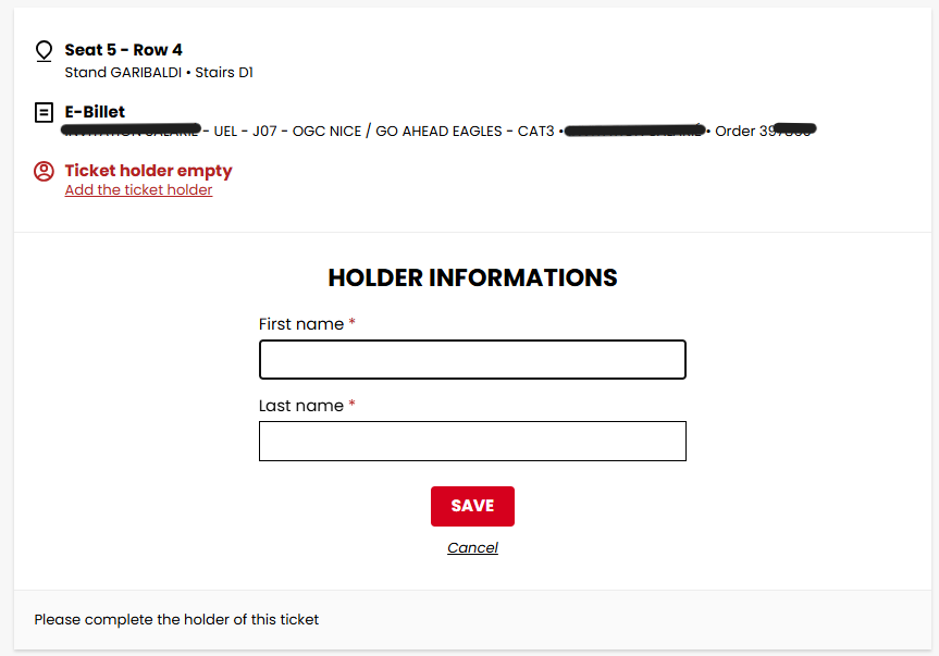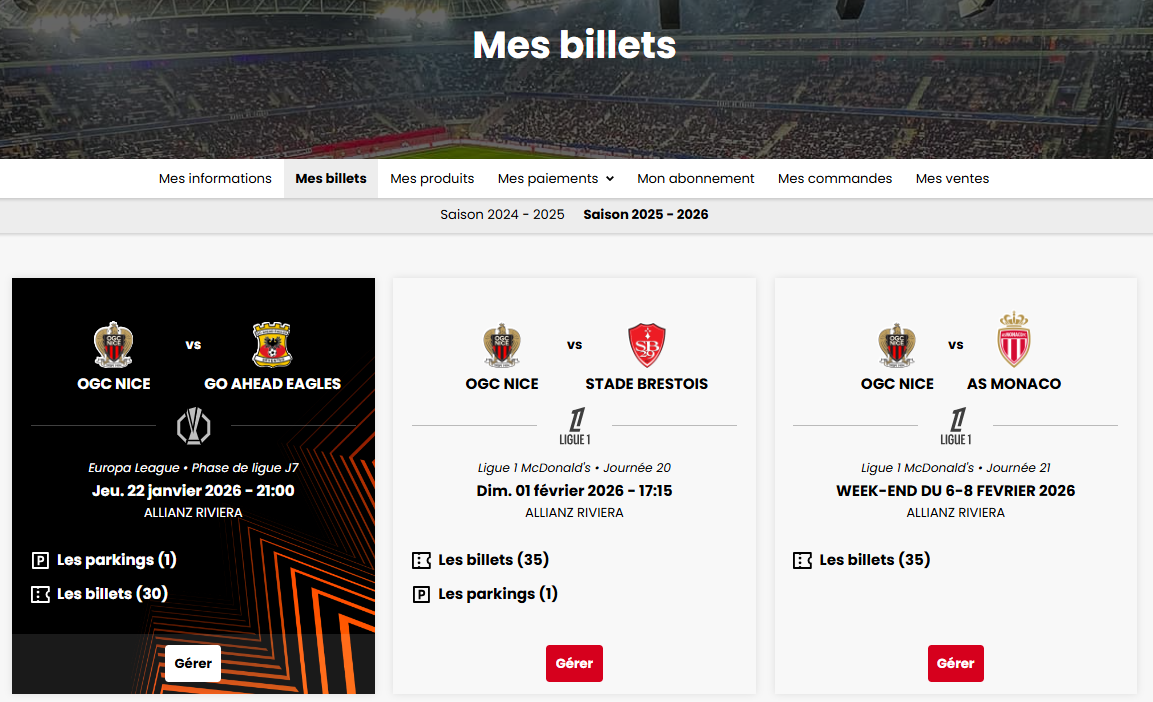Tickets purchased on the OGC Nice ticketing website are generally available for download approximately 10 days before the match date. Tickets are personalised and must first be completed with the first and last name of the ticket holder in your customer account before being downloaded.