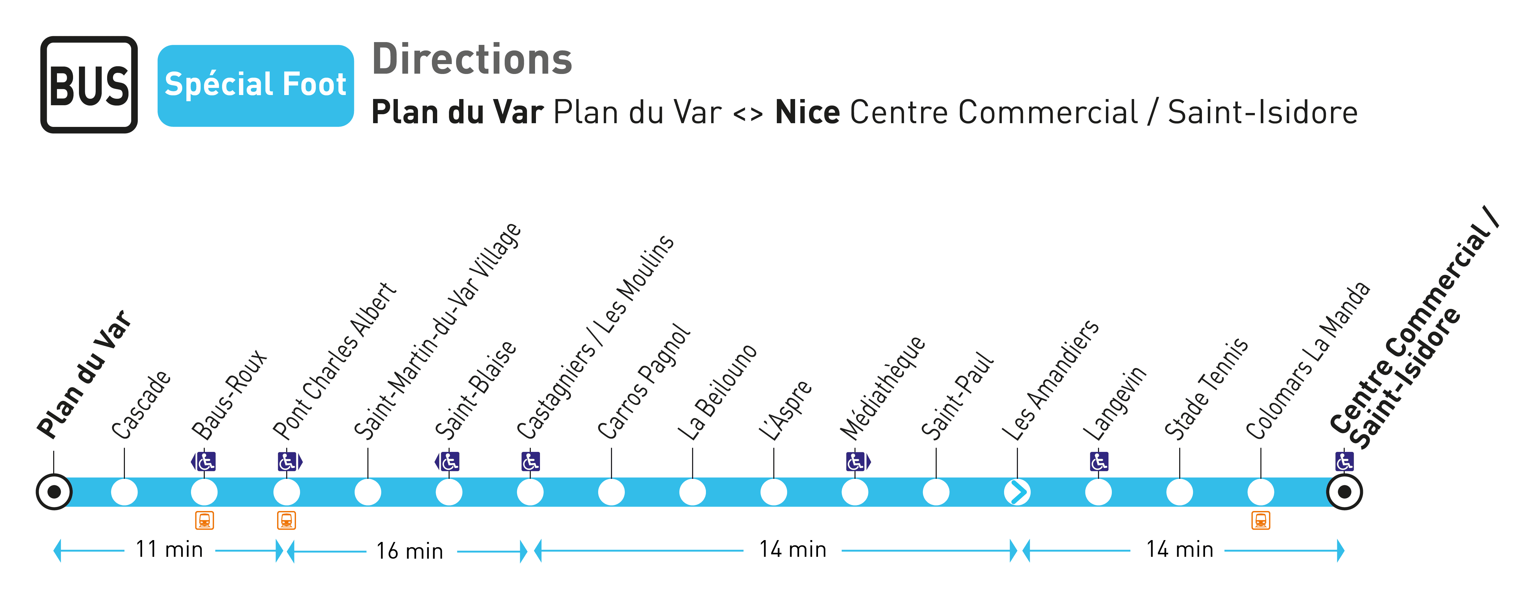 A “Special Matchday” shuttle line operates between Plan du Var and Centre Commercial / Saint-Isidore on matchdays. It runs from 2.5 hours before kick-off and provides return services up to 45 minutes after the end of the match.